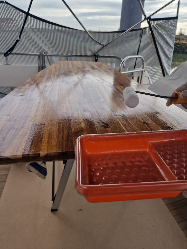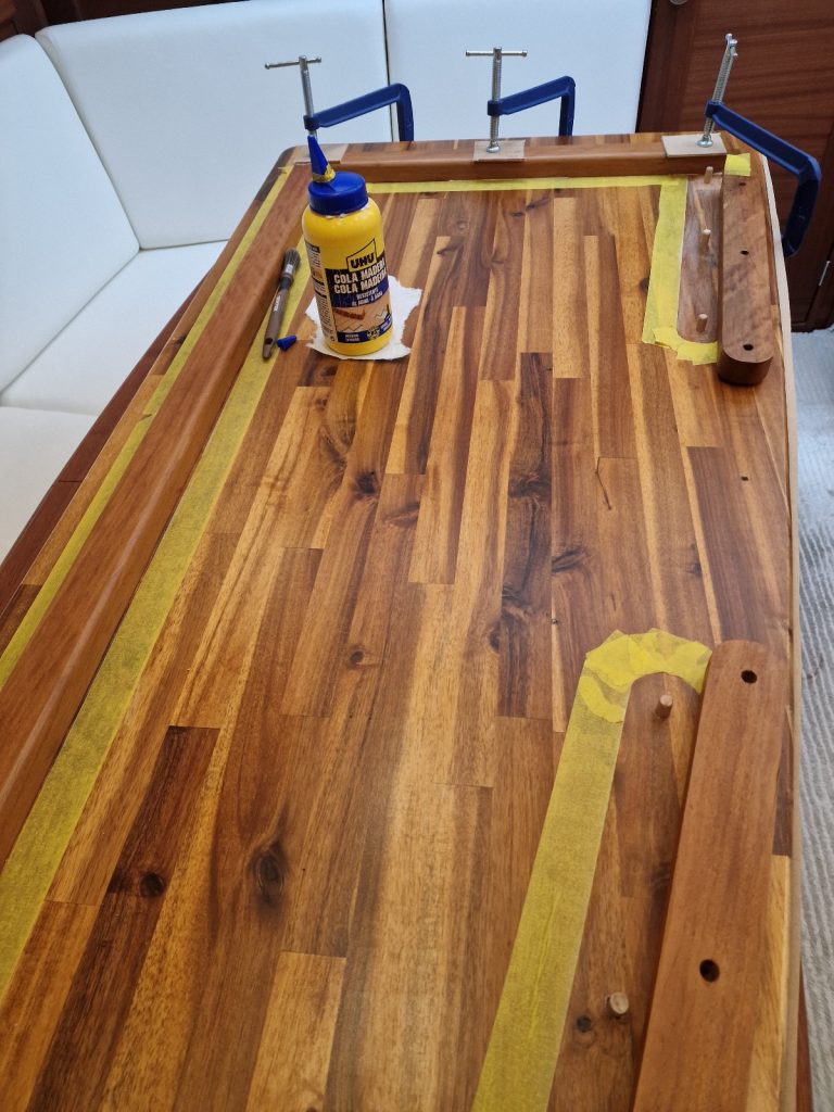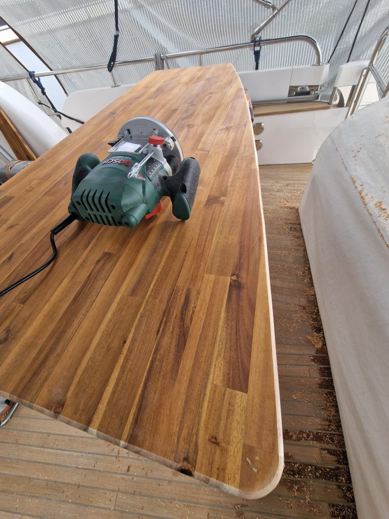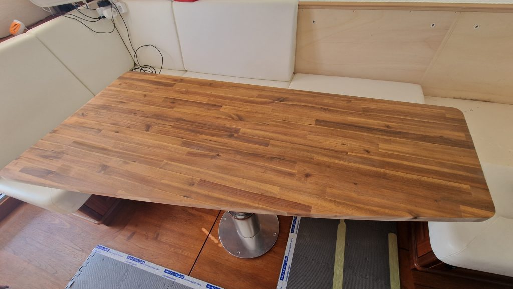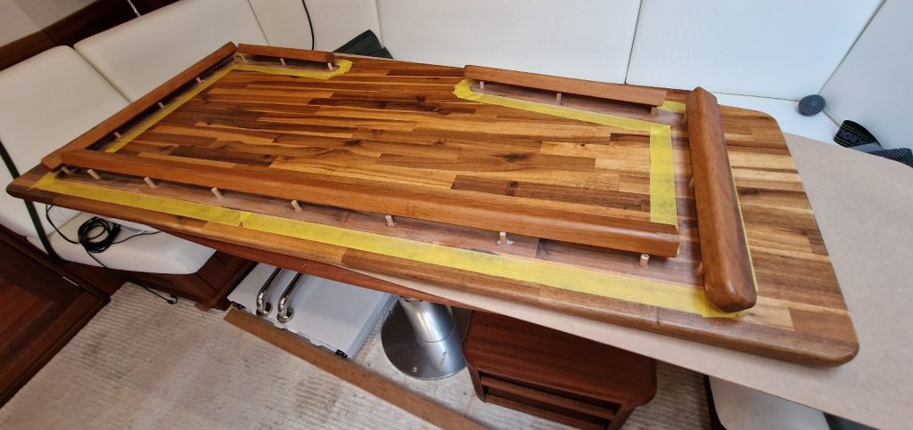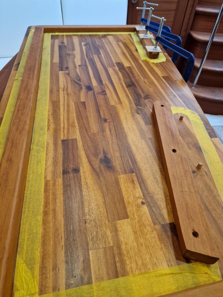 Making sample from cardboard Cutting woodRemoving old glue with heating gunBase is lifting up and down. Measurement on highest levelMeasurement on low levelMaking edges Two coats 105 Epoxy resin and 206 hardener coating Sanding with 240 after epoxy has dried Matte varnished one coat with a thinnerCleaning cloths. Brush spinner cleanerSecond varnish coat Adding varnished strengtheners for robust stabiltyGlueing support barsGlueing long sideNext bar after 24 hoursNext bar after 24 hours Installed and ready to go