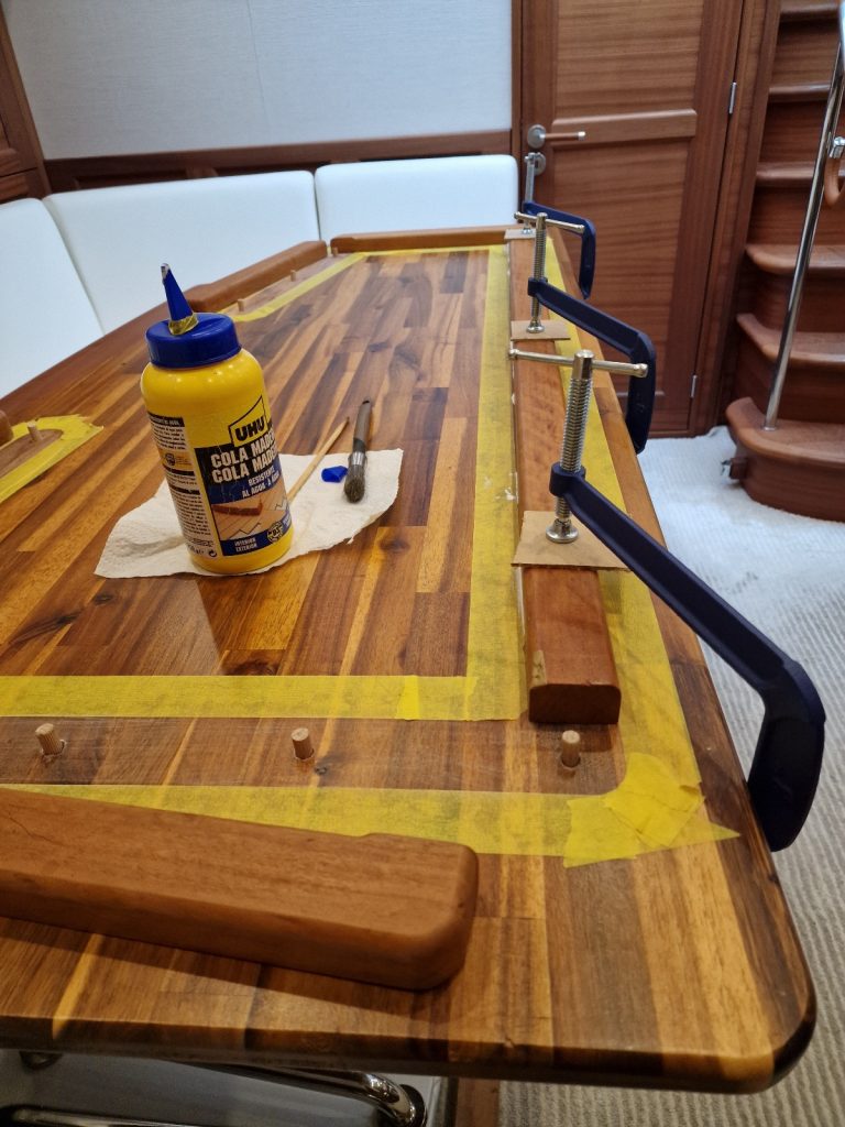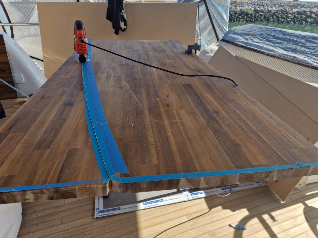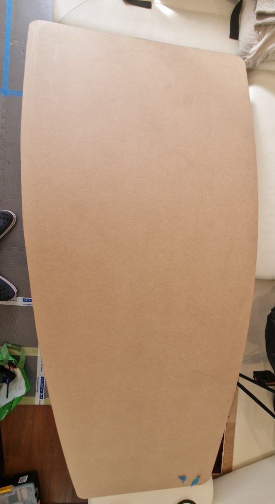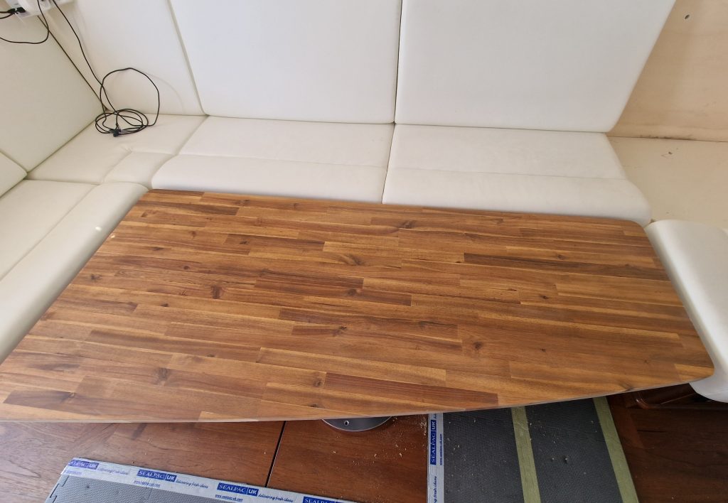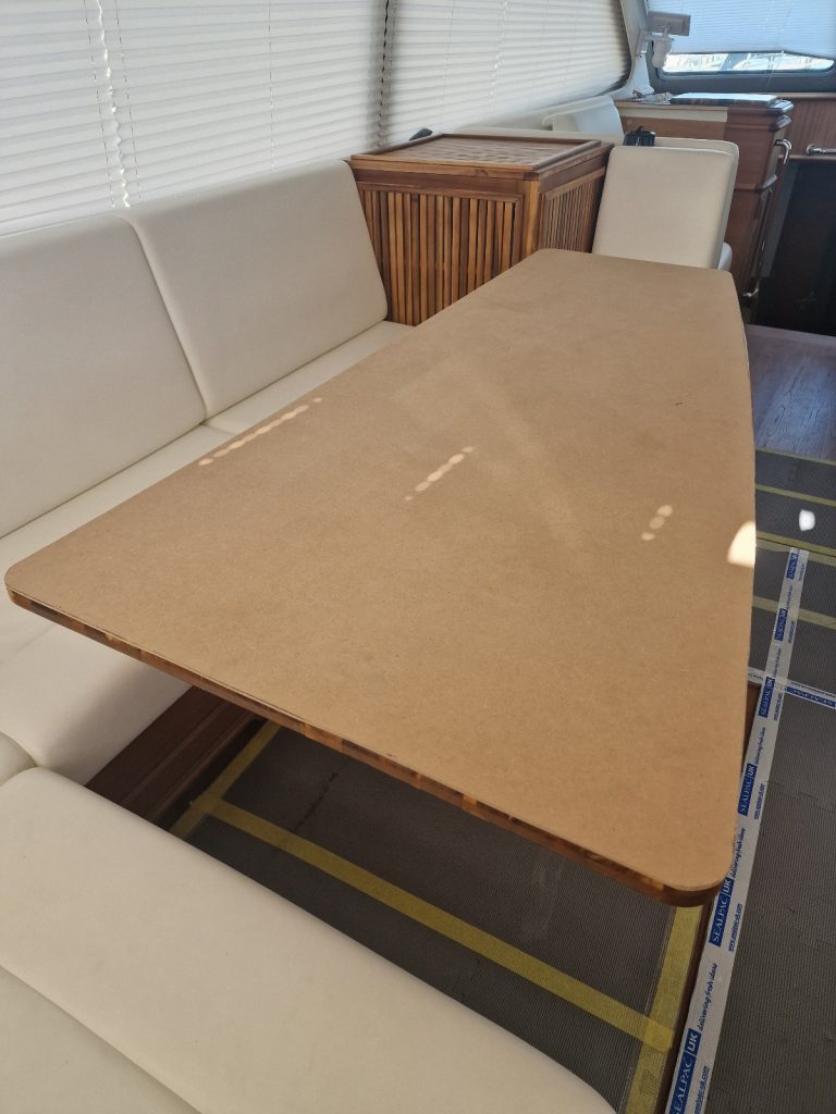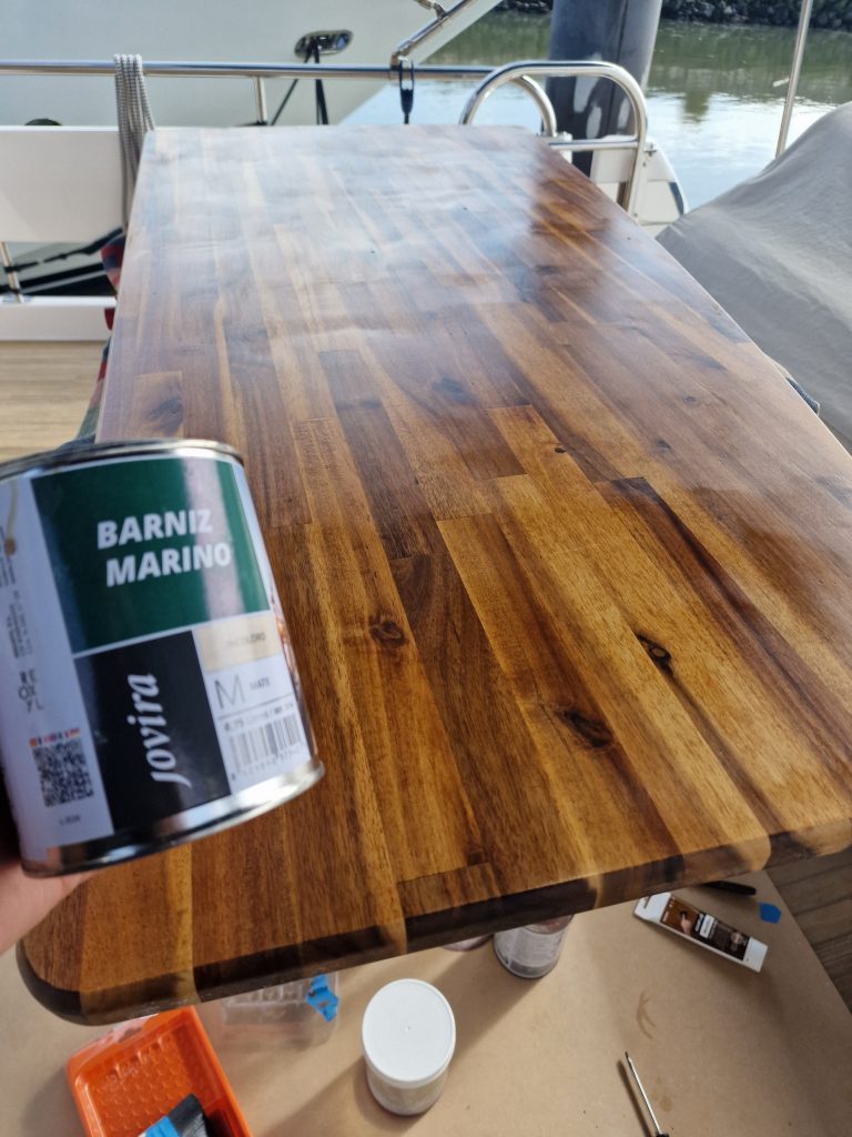 Making sample from cardboard Cutting woodRemoving old glue with heating gunBase is lifting up and down. Measurement on highest levelMeasurement on low levelMaking edges Two coats 105 Epoxy resin and 206 hardener coating Sanding with 240 after epoxy has dried Matte varnished one coat with a thinnerCleaning cloths. Brush spinner cleanerSecond varnish coat Adding varnished strengtheners for robust stabiltyGlueing support barsGlueing long sideNext bar after 24 hoursNext bar after 24 hours Installed and ready to go