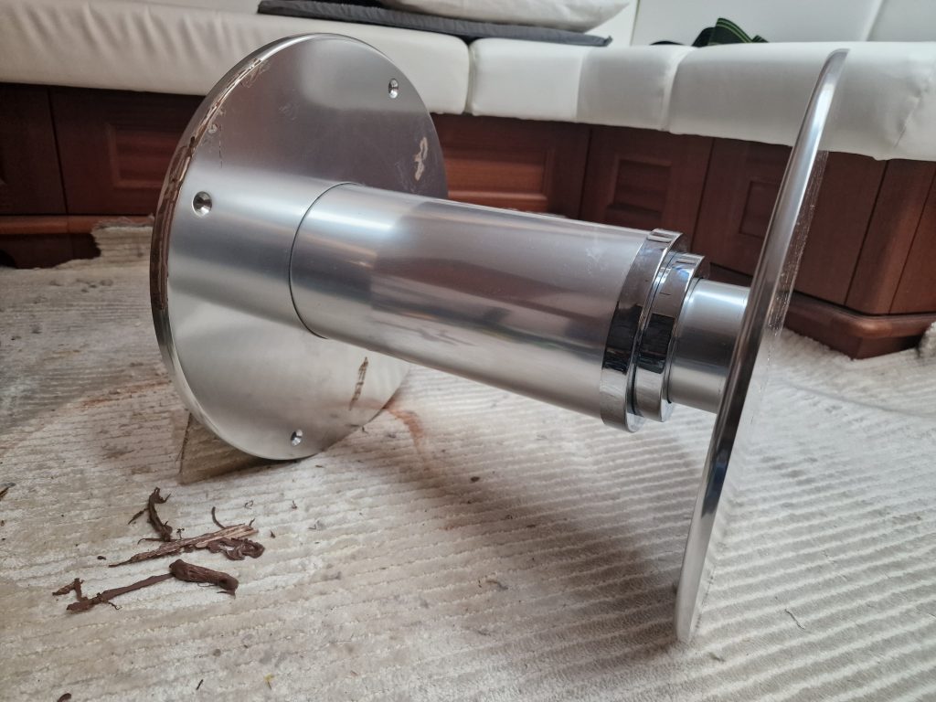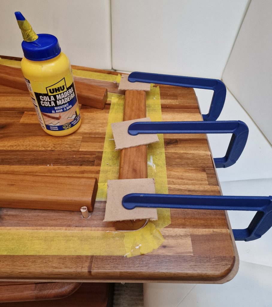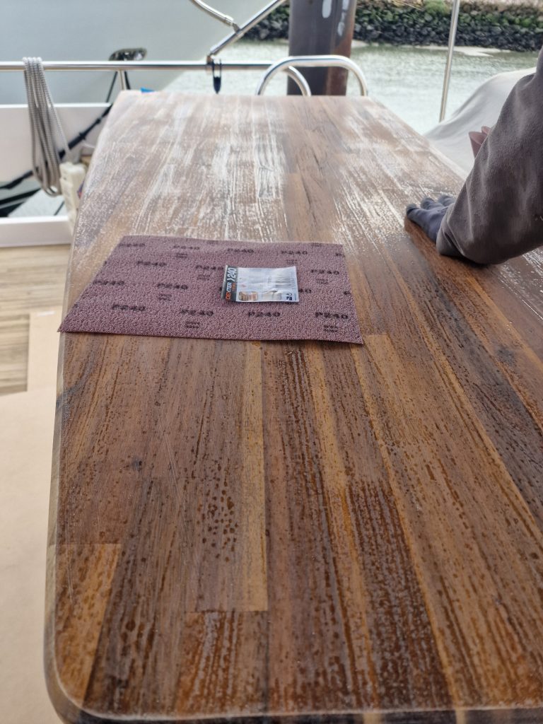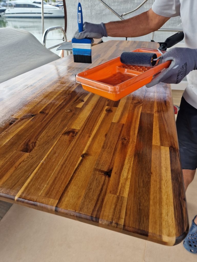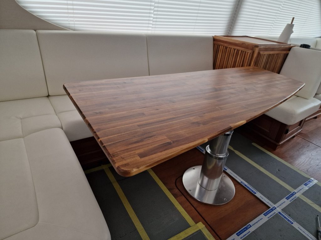 Making sample from cardboard Cutting woodRemoving old glue with heating gunBase is lifting up and down. Measurement on highest levelMeasurement on low levelMaking edges Two coats 105 Epoxy resin and 206 hardener coating Sanding with 240 after epoxy has dried Matte varnished one coat with a thinnerCleaning cloths. Brush spinner cleanerSecond varnish coat Adding varnished strengtheners for robust stabiltyGlueing support barsGlueing long sideNext bar after 24 hoursNext bar after 24 hours Installed and ready to go